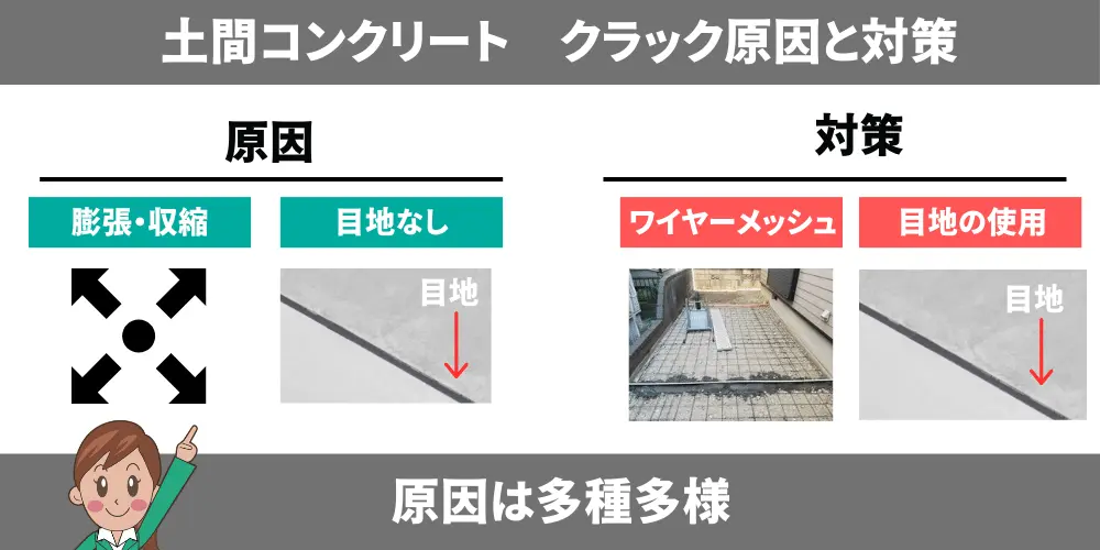 もちろんこれだけが全ての原因ではありません。コンクリートに継ぎ目(伸縮目地)を入れなかったなど様々な理由はあります。