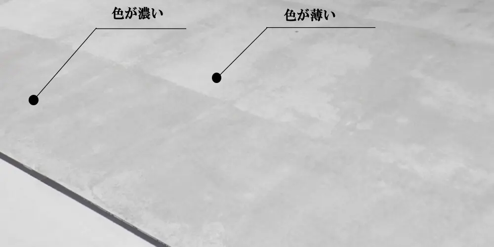 コンクリートに含まれる水分や薬材が乾くのに半年から1年ぐらいかかります。放置しておくと白くなってきます。それでも色むらが起きる場合はご連絡ください。