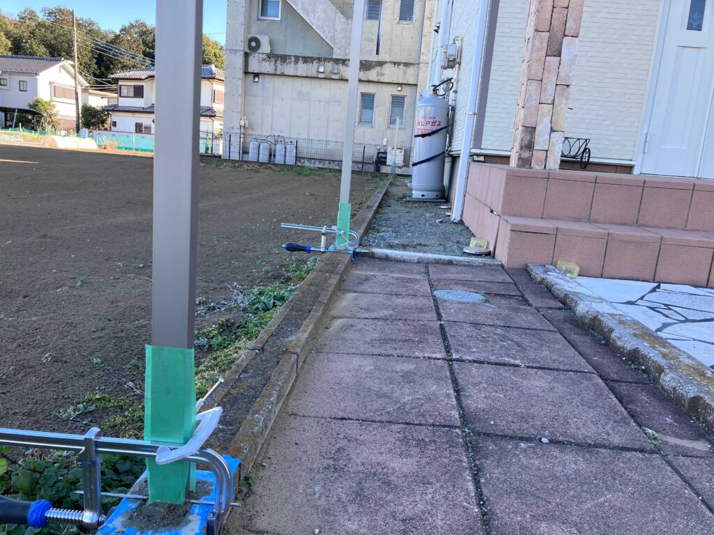 強風の時や、モルタルが軟い時などは、治具を使用して柱が傾いてしまわないように工夫が必要です。
