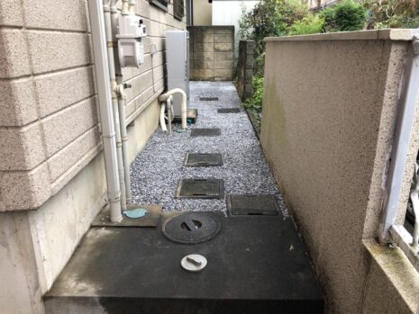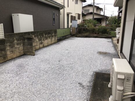 砂利敷き 雑草防止・防犯効果。防草シートと併用される。