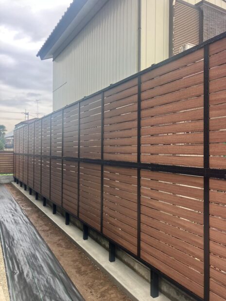 使用した商品は、LIXILのフェンスAB YS3型 チェリーウッド+ブラック色の多段フェンスです。
