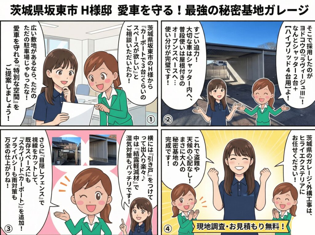 【茨城県坂東市】愛車を守る4台用ガレージ!ヨドコウ「ラヴィージュⅢ」で叶える、趣味と実用の広々空間