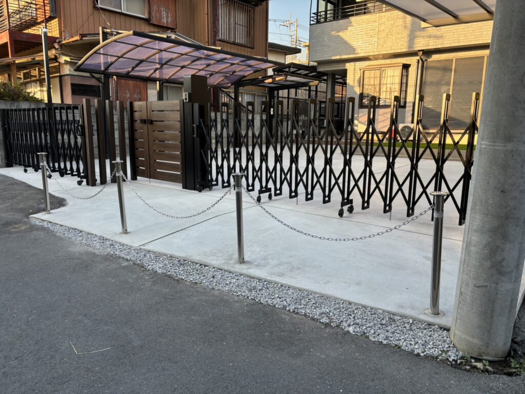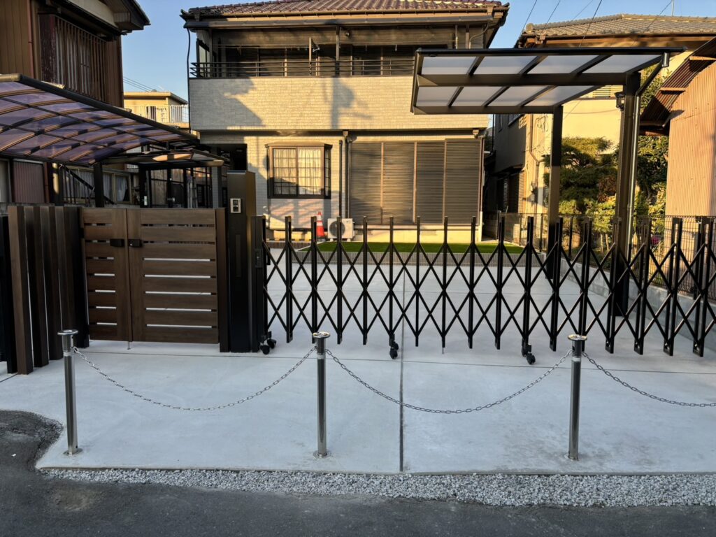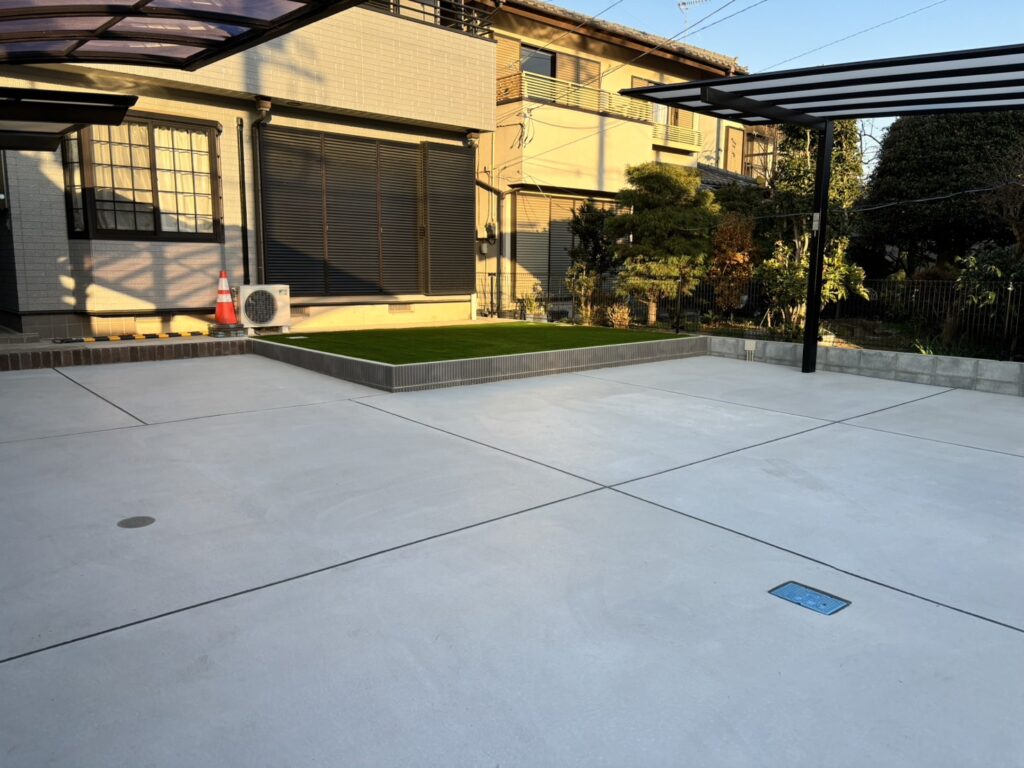 今回は、人工芝、伸縮門扉、土間コンクリート工事等を施工中です。
