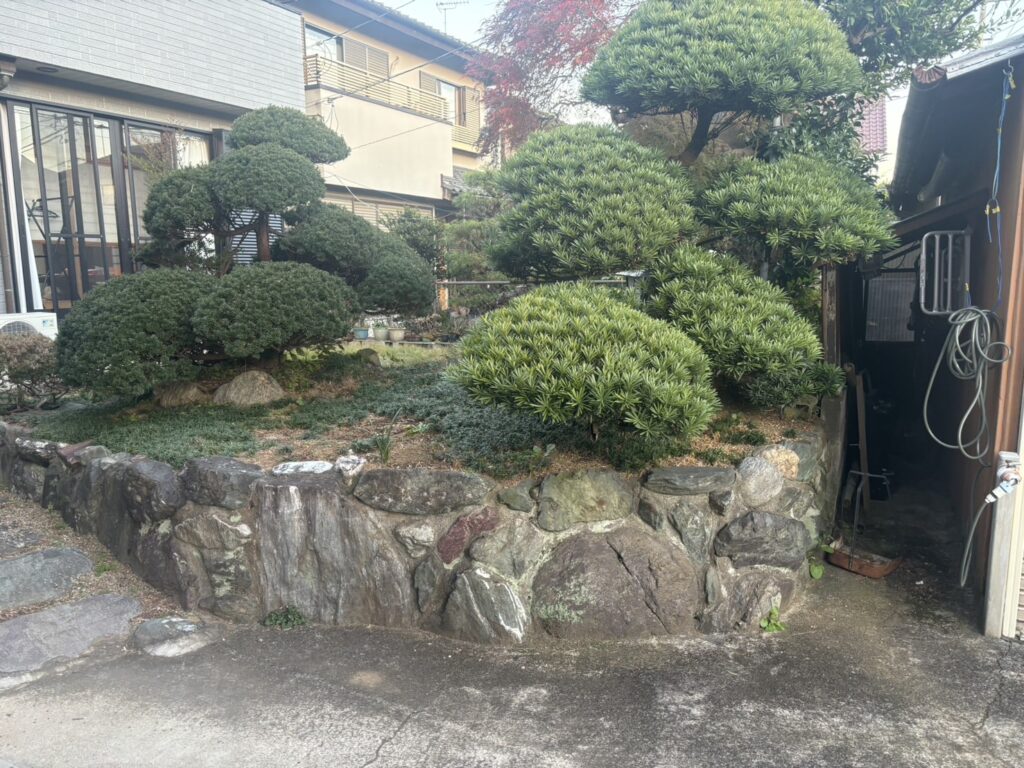 最初の状態は、日本庭園のような素敵なお庭でしたが管理が大変な為シンプルで生活がしやすいお庭にしたいとのことでした。