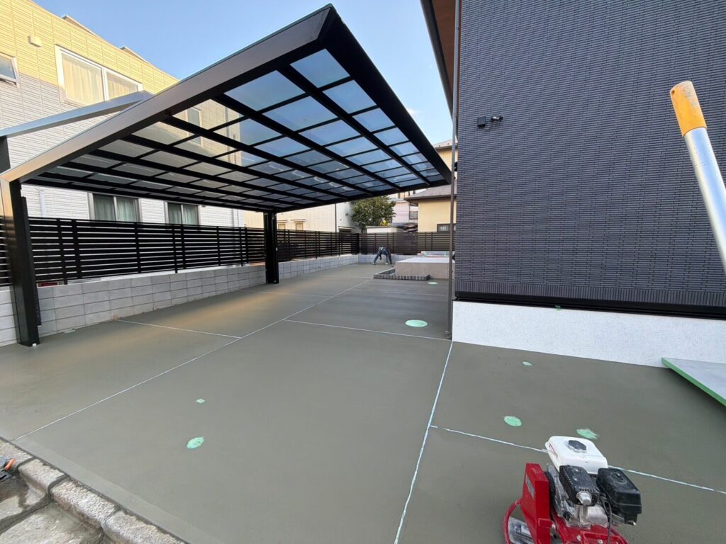 フェンス工事・カーポート工事に続き、駐車場の土間コンクリート打設工事を行いました。