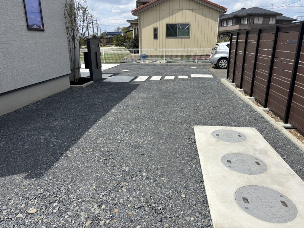 駐車場まわり 土間コンクリート 駐車スペースをコンクリートで舗装。耐久性・雑草対策に優れる。