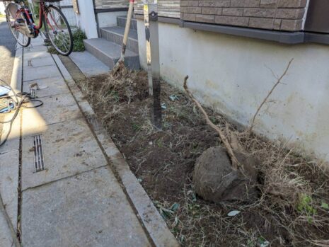 今回は、植栽を伐採抜根してインターロッキングの施工を行いました。