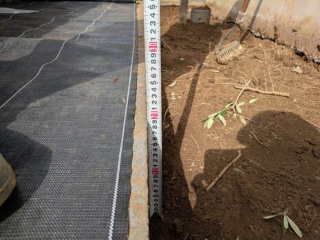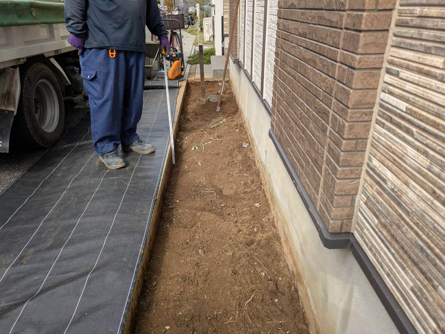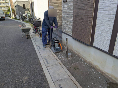 まずは、木を撤去後に20センチ程掘削を行い路盤工の為に砕石を敷きランマとプレートを使用し下地を調整しました。