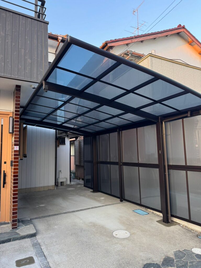 埼玉県蓮田市で車一台用のカーポート 三協アルミ カムフィエースの施工が完了しました。