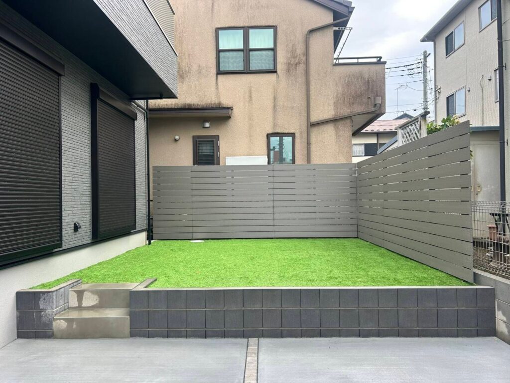 目隠しは、木樹脂を使用したF&Fのニコボードを使用してお庭には、人工芝を。