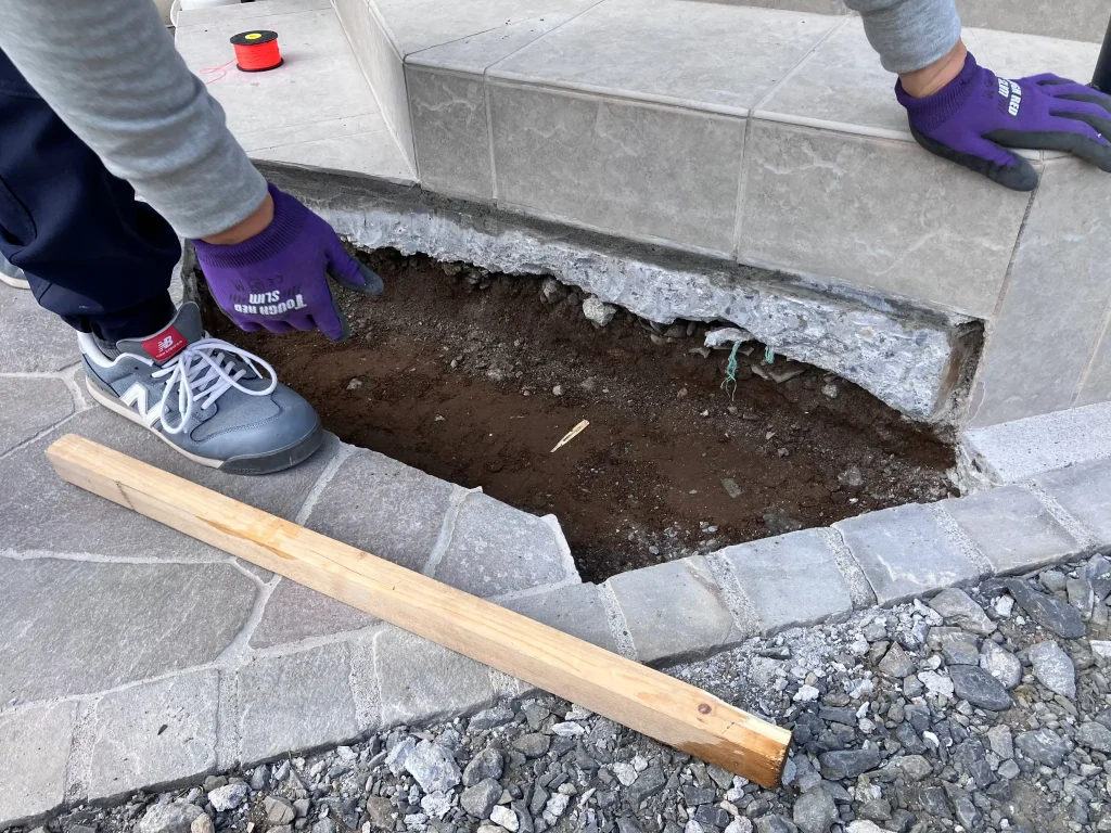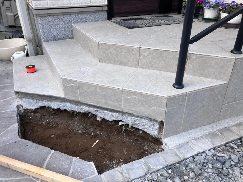 - 既存ステップ部分の解体: 構造体を壊す際、玄関本体に影響が出ないよう慎重に作業を進めました。