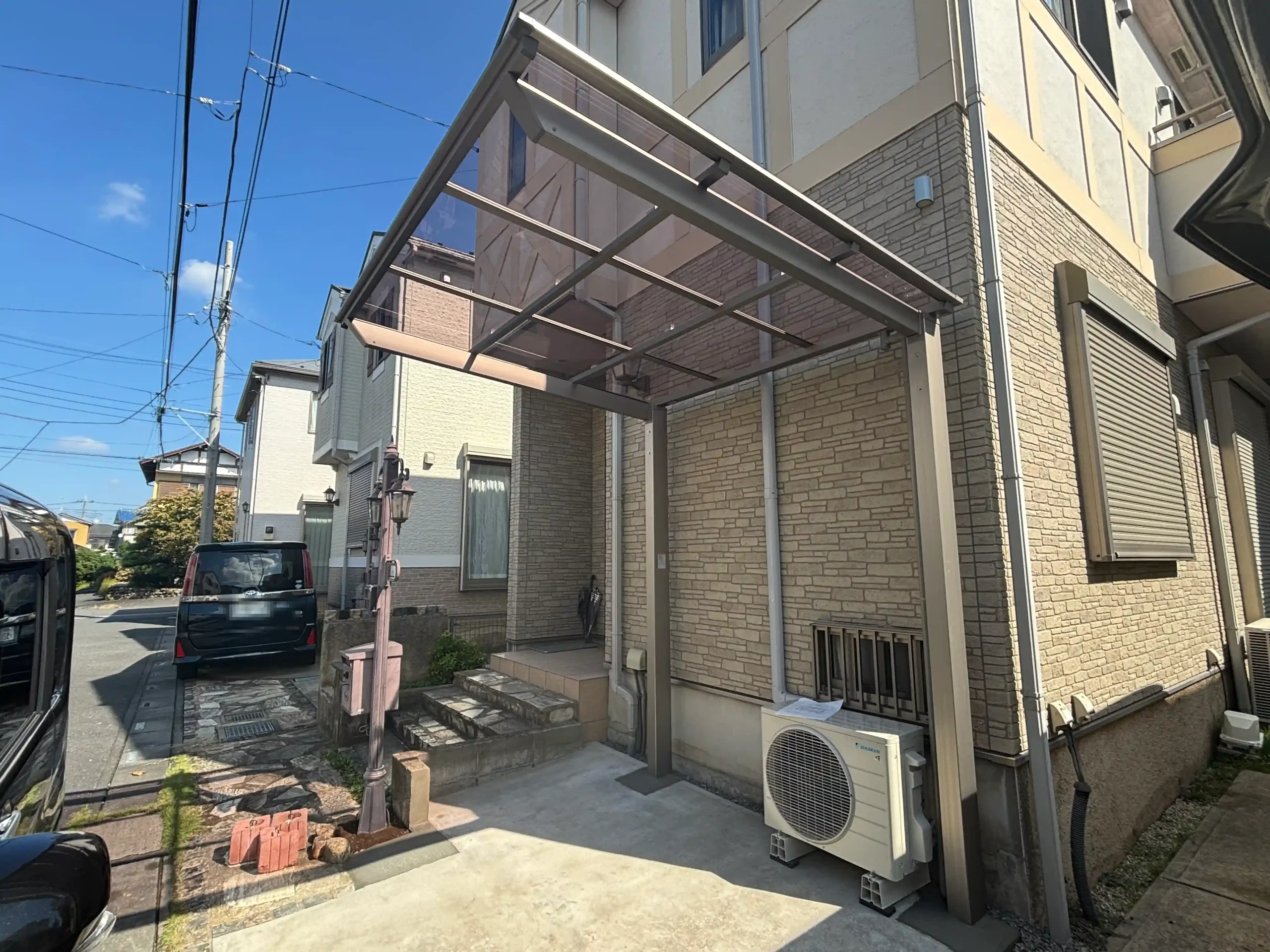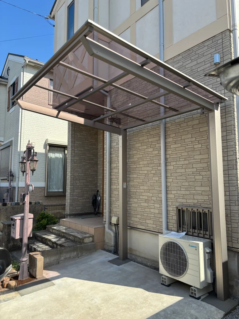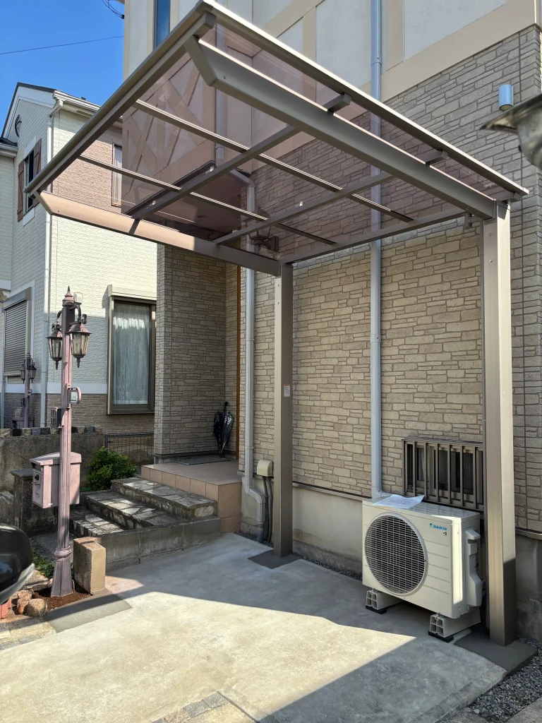 また、エアコン付近に柱をたてお家壁面にサイクル屋根をギリギリまで寄せられるようにしました。