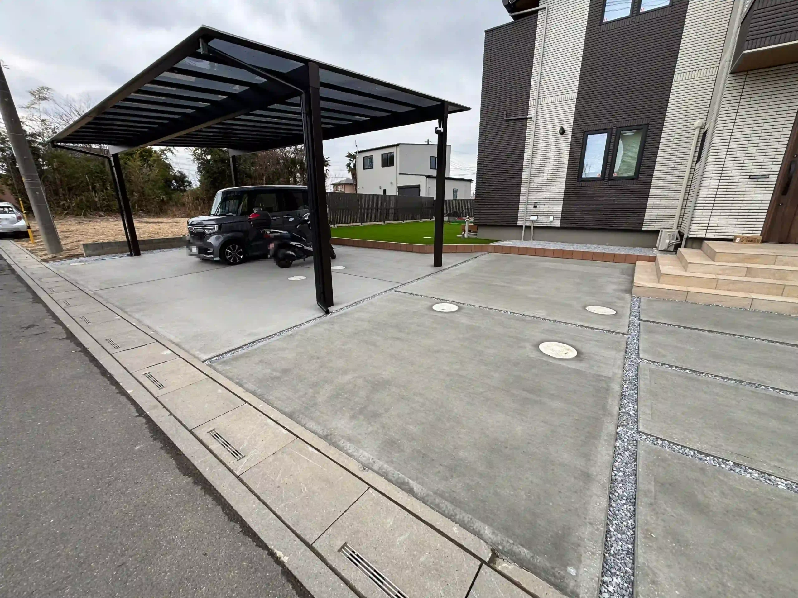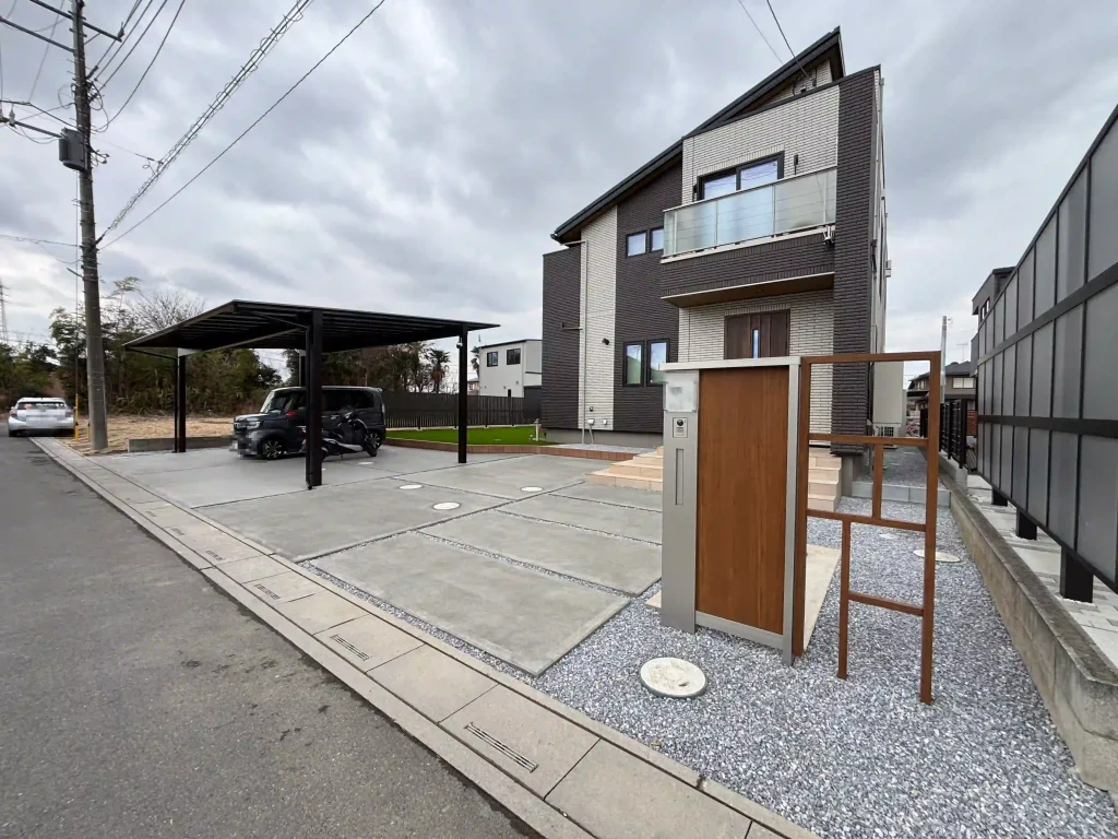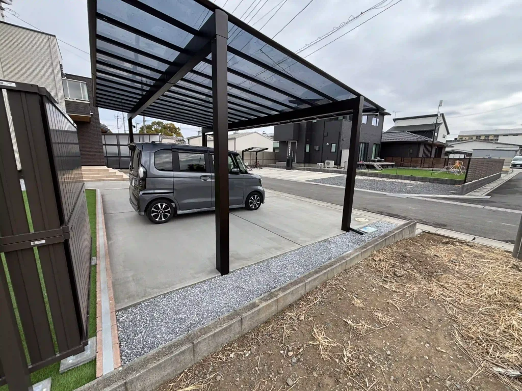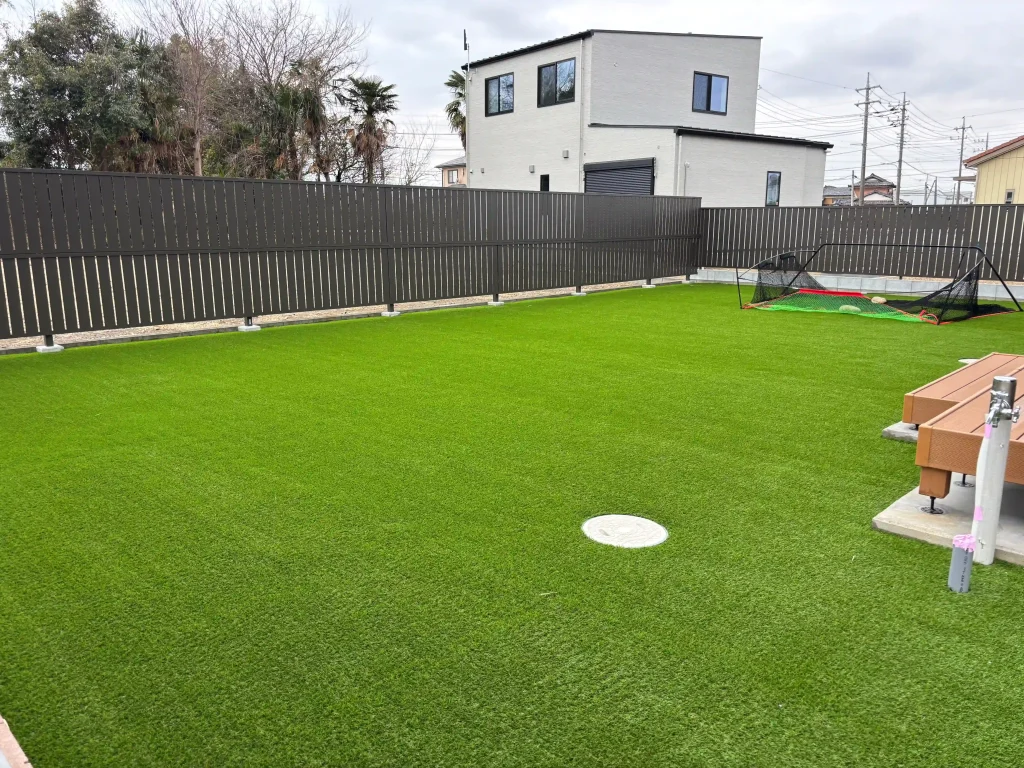 | 施工内容 | 新築外構工事・駐車場工事(土間コンクリート)・お庭目隠しフェンス・人工芝20mm・カーポート工事・機能門柱・ブロック基礎工事・雑草対策工事 |