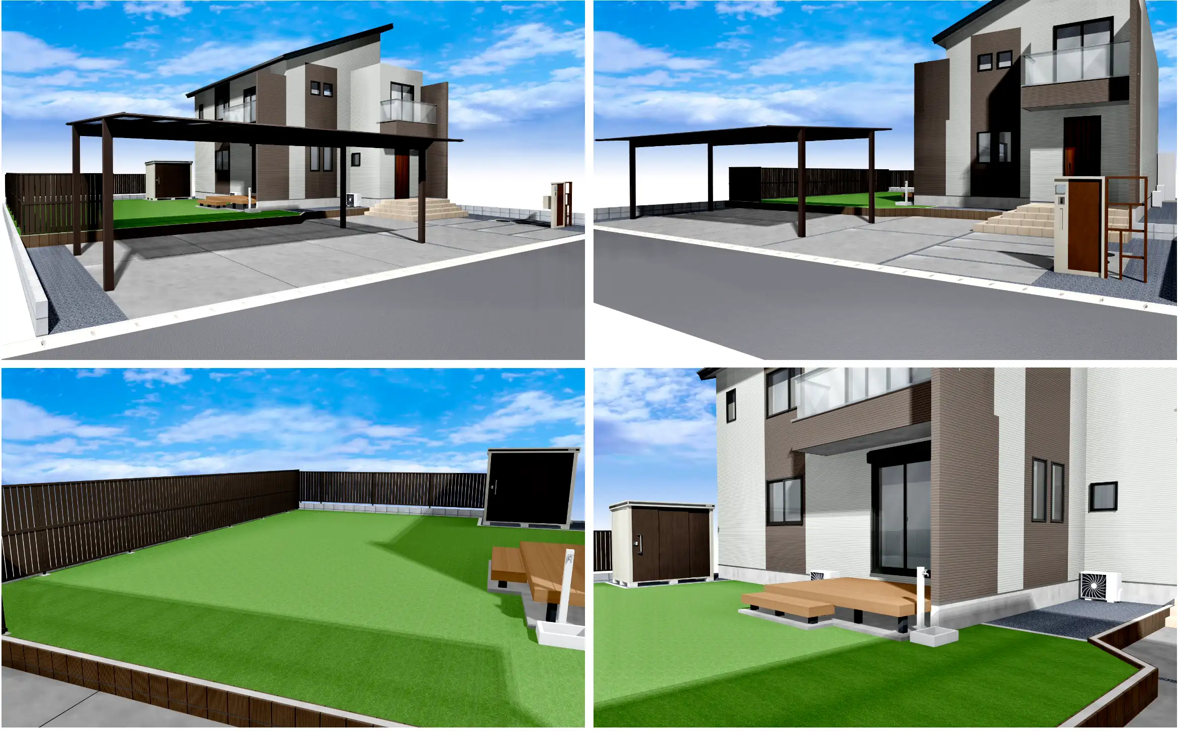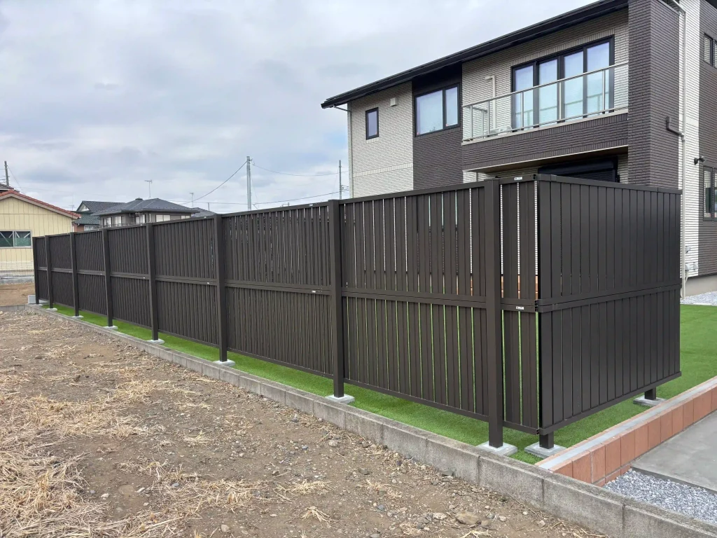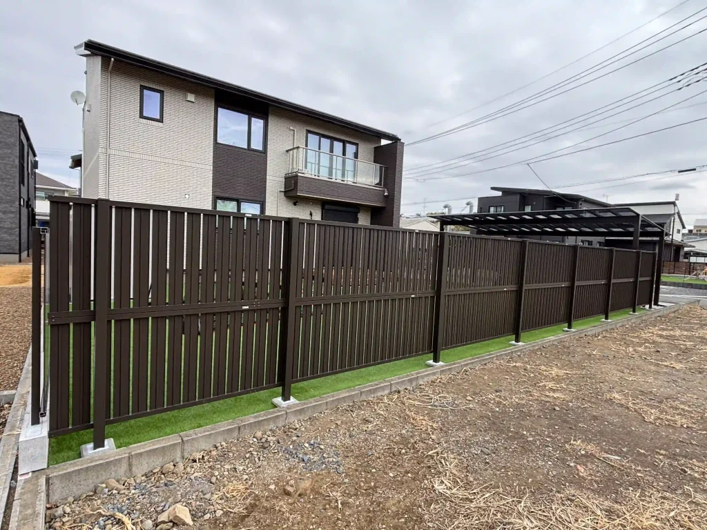 | 施工内容 | 新築外構工事・駐車場工事(土間コンクリート)・お庭目隠しフェンス・人工芝20mm・カーポート工事・機能門柱・ブロック基礎工事・雑草対策工事 |