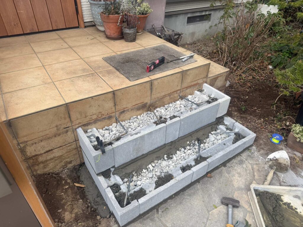 - 悩み: 既存の木造の階段ステップを撤去して玄関階段タイルを増設して欲しい。