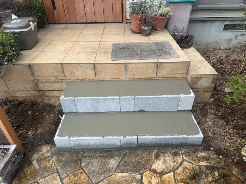 ヒライエクステリア今回は、お客様のご要望に合わせた玄関タイルの階段を設置しました。