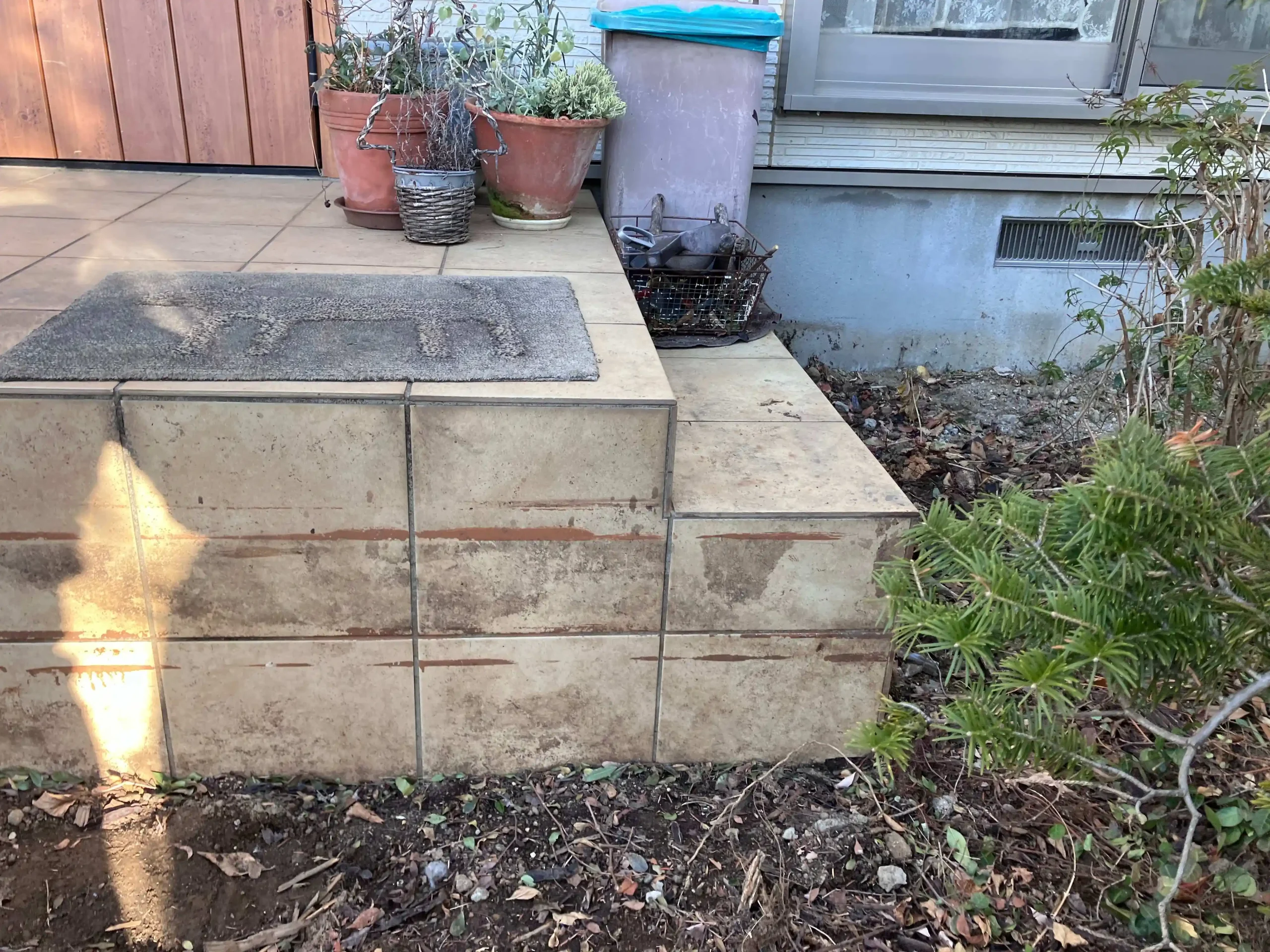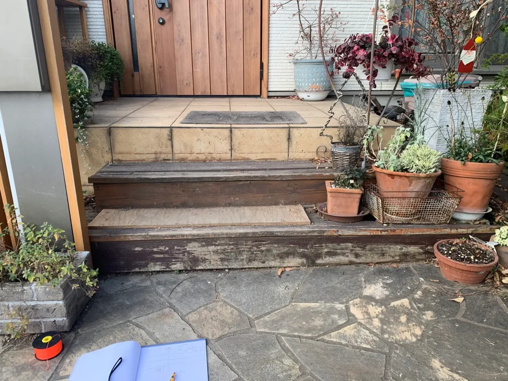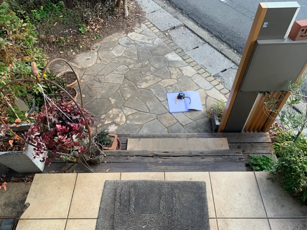 - 悩み: 既存の木造の階段ステップを撤去して玄関階段タイルを増設して欲しい。