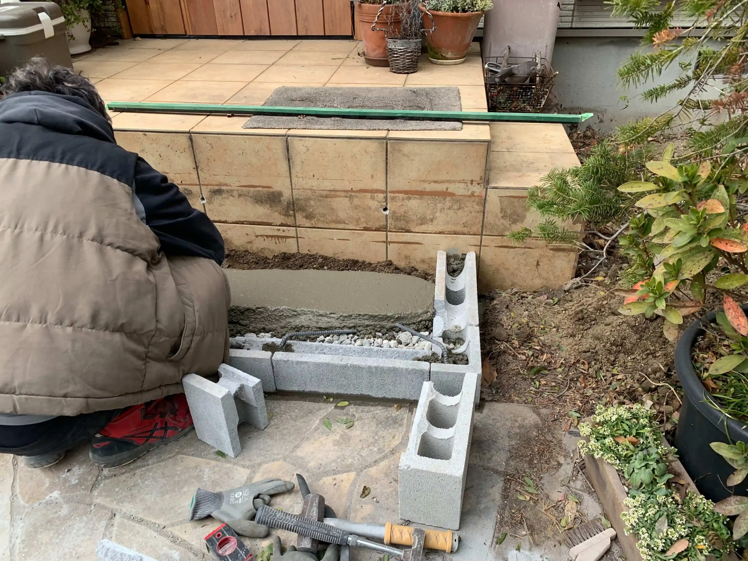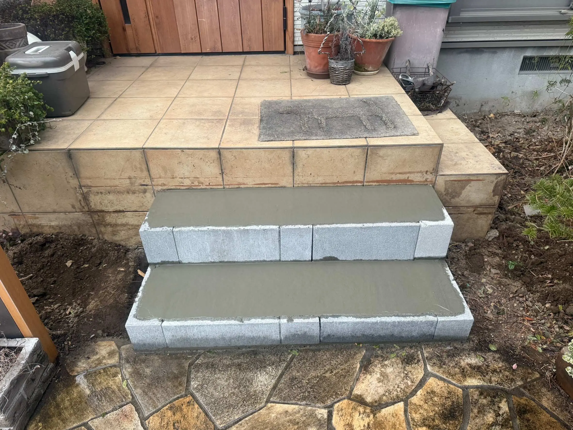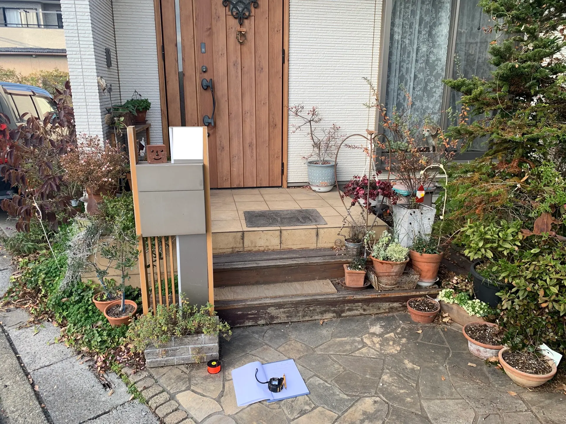 - 悩み: 既存の木造の階段ステップを撤去して玄関階段タイルを増設して欲しい。