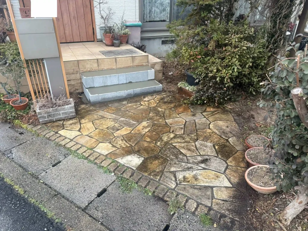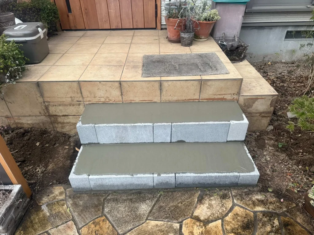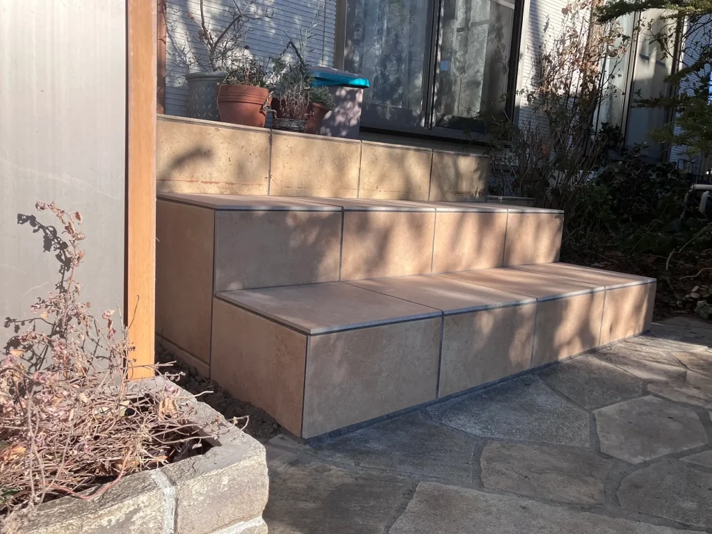 ヒライエクステリア今回は、お客様のご要望に合わせた玄関タイルの階段を設置しました。