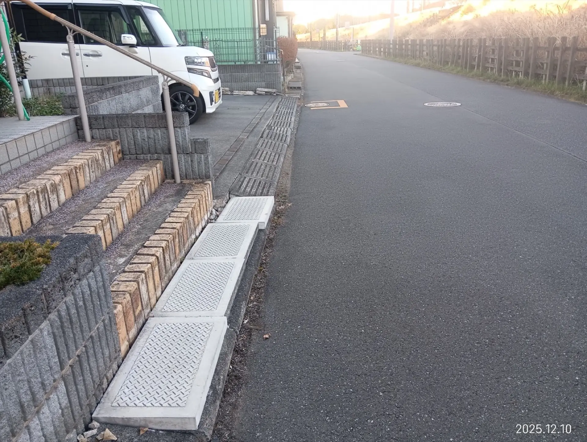 今回のお客様は、道路側溝の蓋を傾斜させて駐車場との段差を無くす為に駐車場の端下に流し込んだセメントが劣化して剥がれて蓋と段差が出来ている。側溝の蓋形状がU字工にハマらない為、車の出し入れで蓋がずれると初回お問い合わせをいただきました。