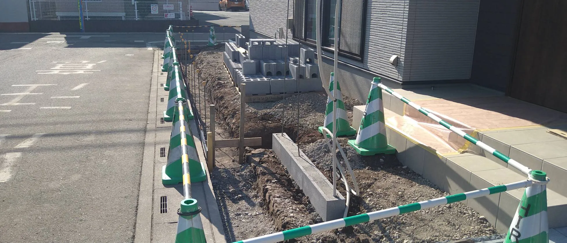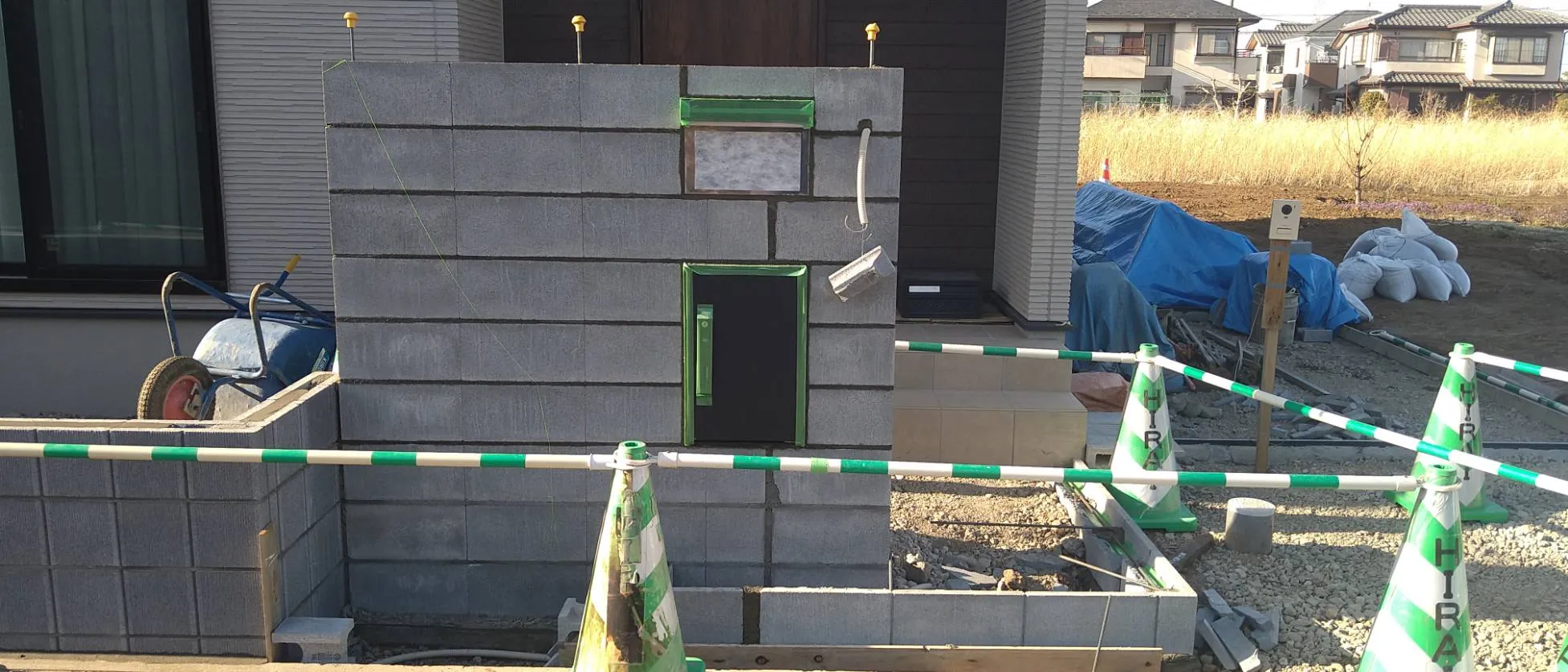 今回のお客様は、希望工事:新築外構、ブロック塀、駐車場工事、物置、門袖、目隠しフェンス、立水栓、植栽・植木伐採・抜根と初回お問い合わせをいただきました。