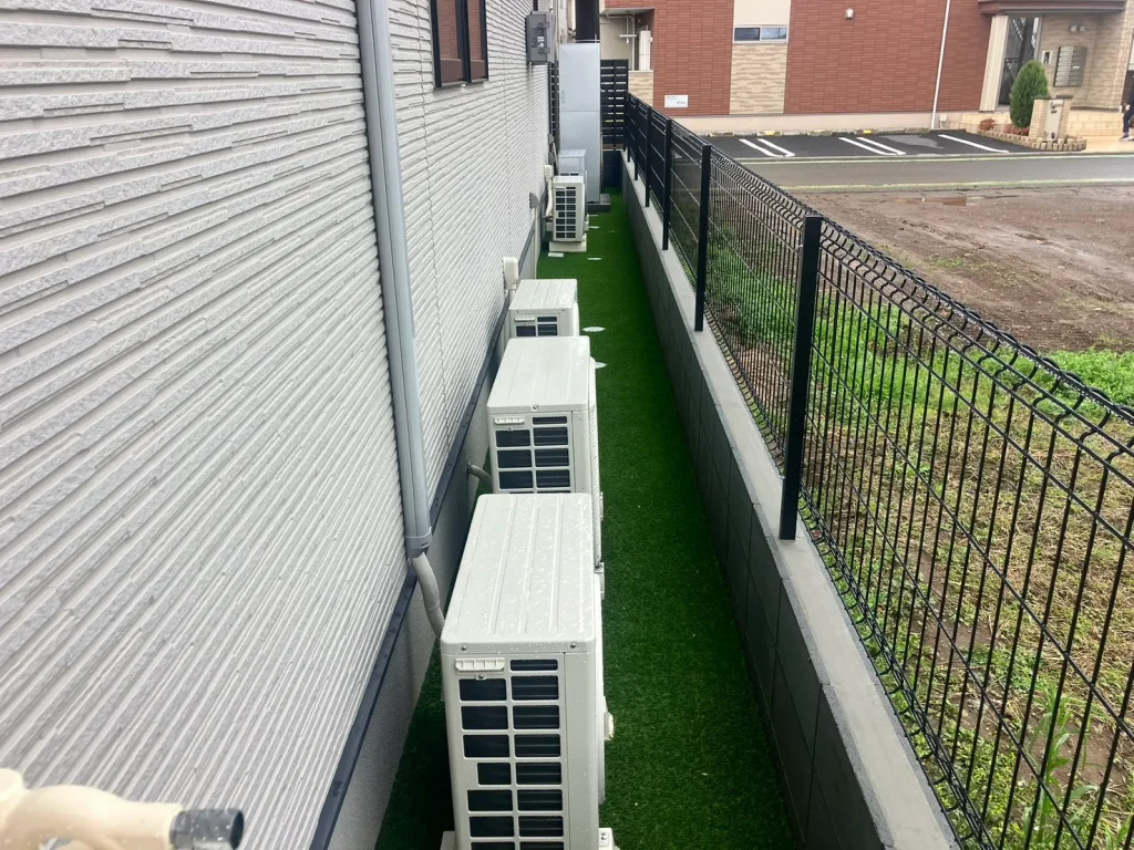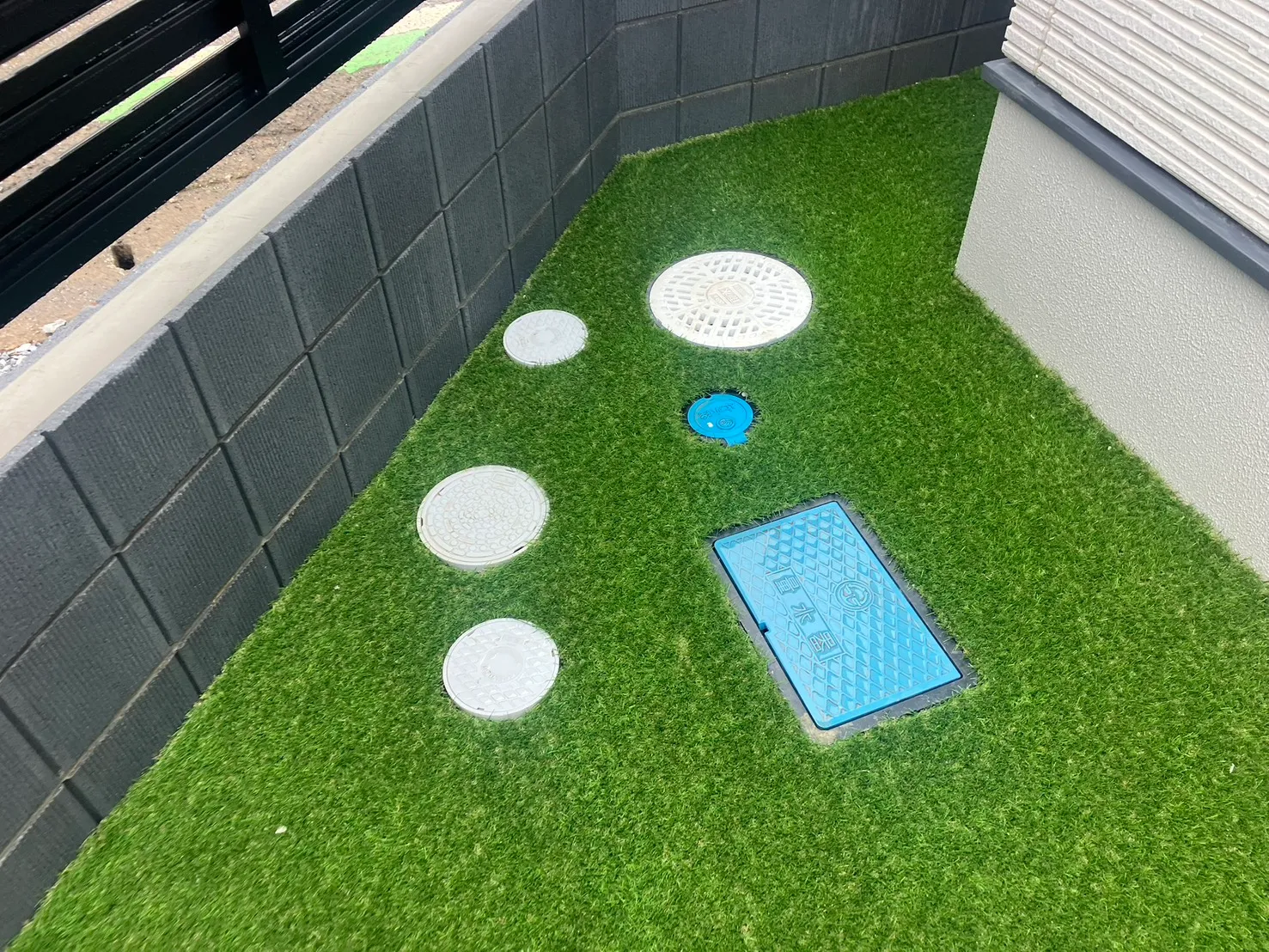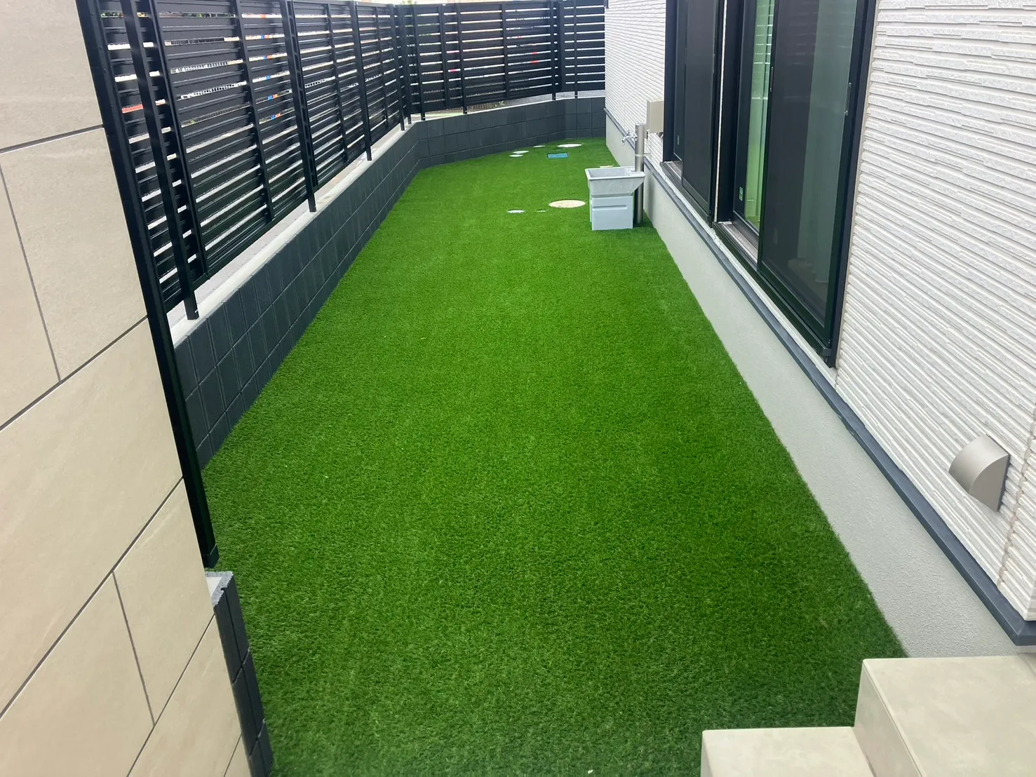 施工内容人工芝(30mm)・土間コンクリート・玄関タイル(パセオ)・門袖(セラマイカ)・割栗石(クラッシュロック)・フェンス(ユメッシュ)・目隠しフェンス(レジリアYK3型)・物置(ヨドエルモ)