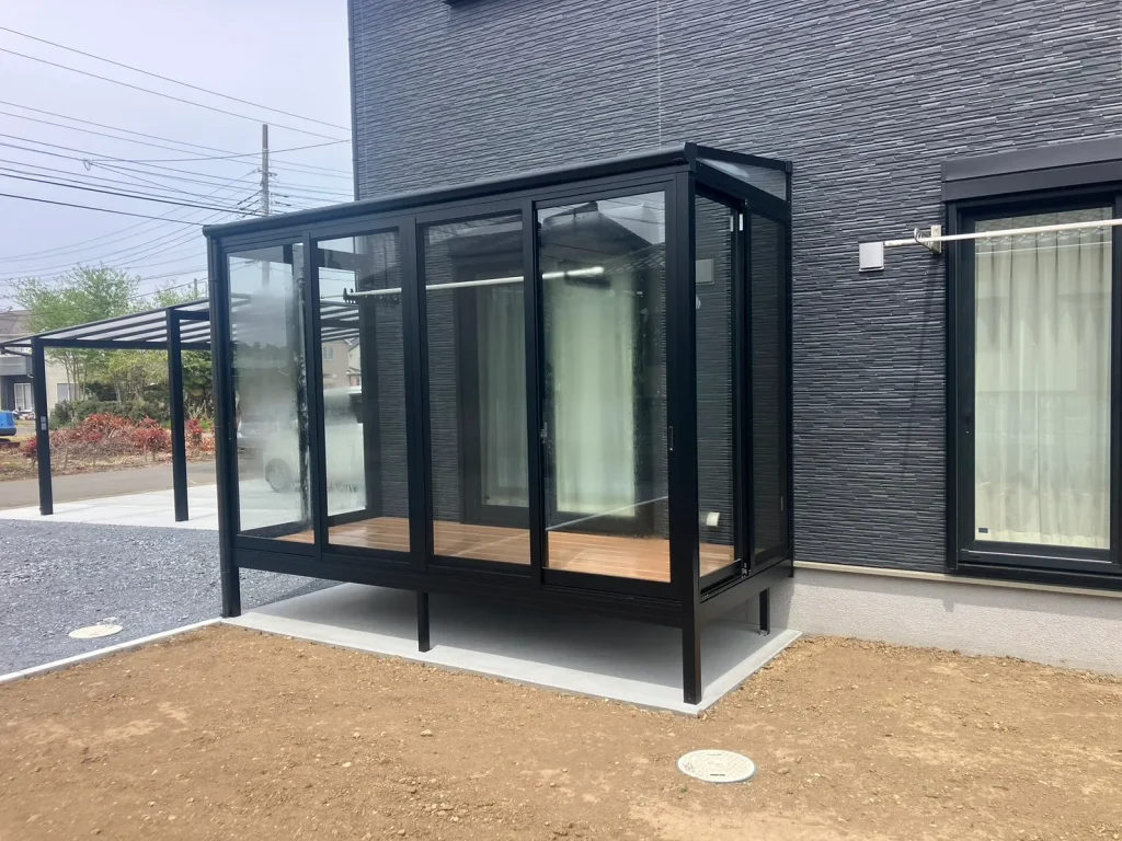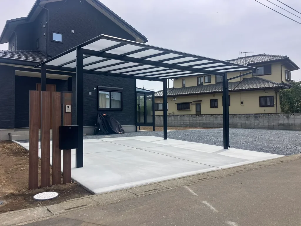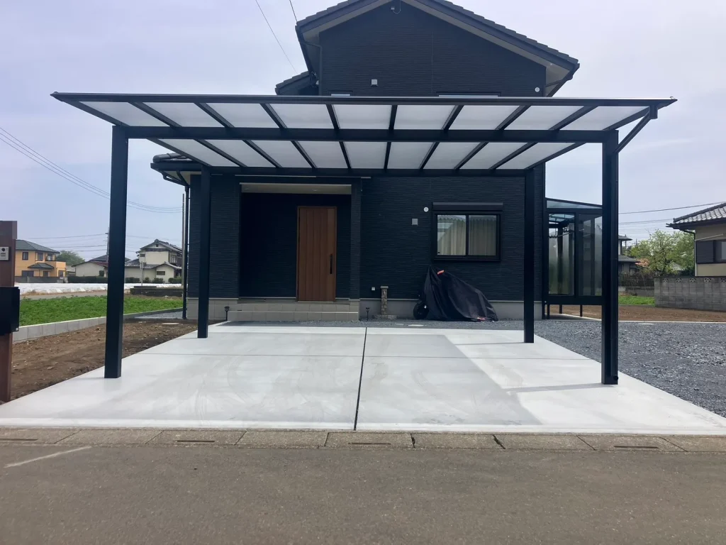 施工内容土間コンクリート・新築外構・機能門柱(エスポII)・カーポート(三協アルミスカイリード)・サンルーム( 三協アルミ 晴れもようwith)
