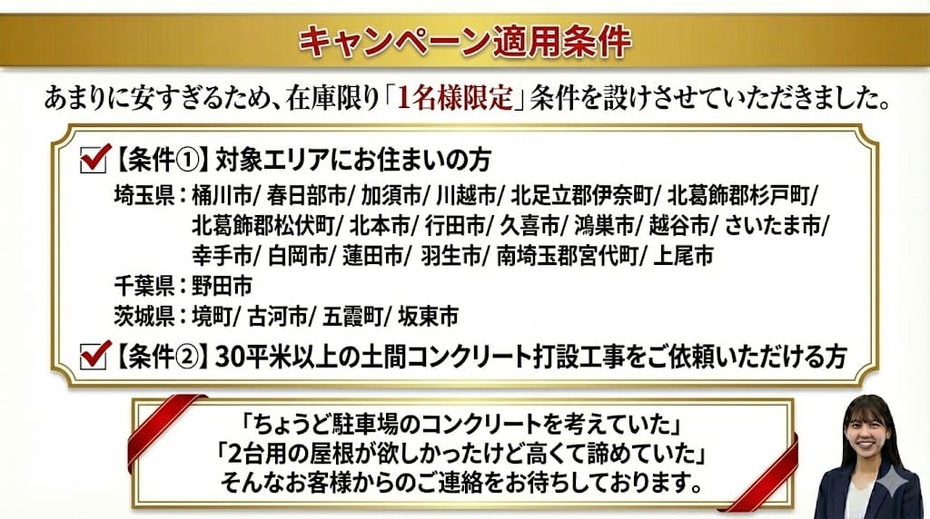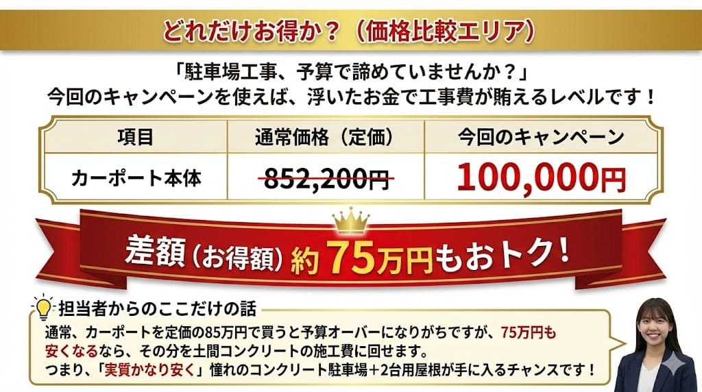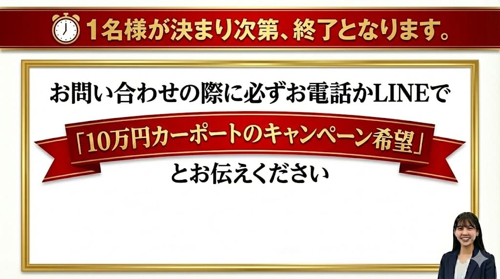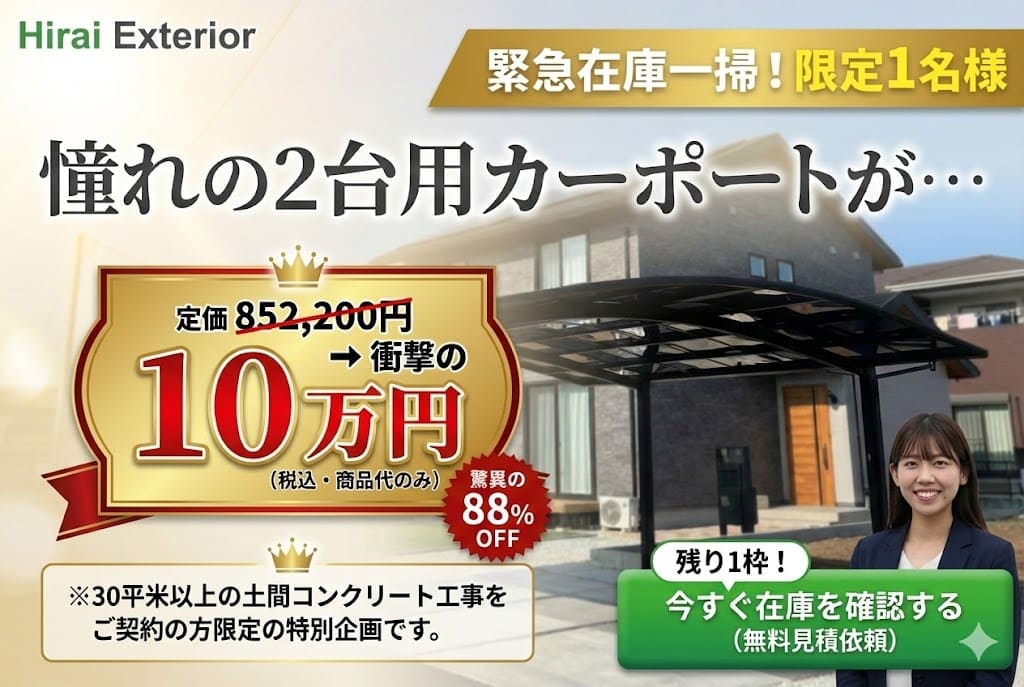 【1名様限定】在庫処分大特価 カーポートキャンペーン実施中!